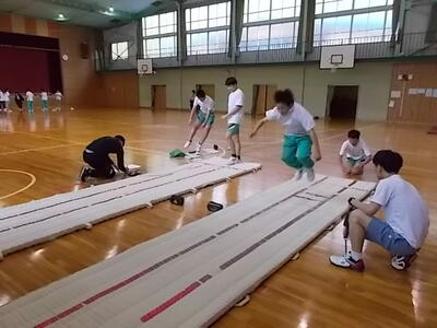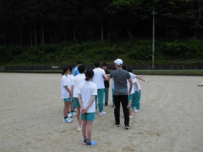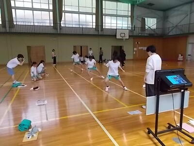 全校で、リレーのバトンパス練習です。10人全員の50mの合計タイムをバトンパスによって短縮しよう」と目標を設定しました。バトンの受け渡しをどのようにするとスムーズにできるかを話し合っていました。