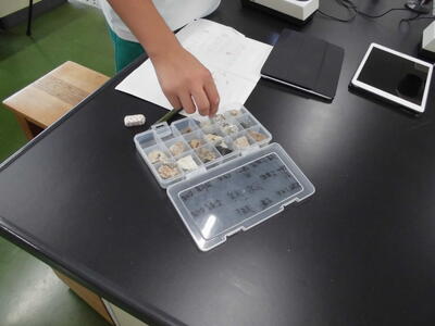 火成岩の特徴を調べていました。本日は安山岩と花崗岩です。サンプルを双眼実体顕微鏡で見てスケッチしたり、写真に撮ったりしました。また、、細かく砕いて鉱物を一つ一つ見ていました。サンプルは、学校の裏の川などで採集したものです。