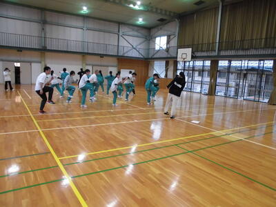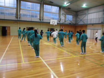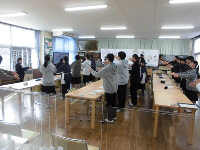 5時限目のはじめは、足を曲げる、手を上にあげる動作から入りました。次に左右に動く動作をプラスしました。生徒たちはぎこちなくも楽しそうにリズムにのって、ダンスをしていました。