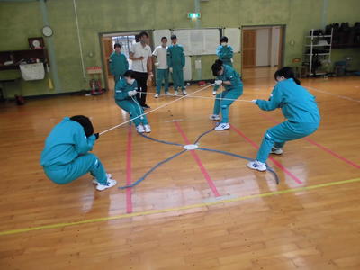 山口先生が綱引きを使って、「力の合成」の授業を行いました。一見体育の授業に見えますが、紛れも無く体育の授業です。