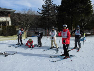 茶臼山高原スキー場で全校スキー教室を行いました。4人のインストラクターの方に1日みっちり教えていただきました。生徒も先生もすごく軽やかに滑れるようになったように見えました。写真は、開始前の4枚と、閉会式の1枚です。