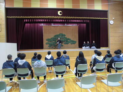 本日は「柿山伏(かきやまぶし)」と「附子(ぶす)」を鑑賞しました。みんなで狂言「蝸牛(かぎゅう)」の謡(うたい)もしました。ある生徒は「狂言をやっている人の動きのキレがすごい。」と感心していました。