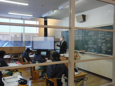 ウインドブレーカーを着て授業(教頭先生はこのあと、職員室でペレットストーブで体を温めていました。)