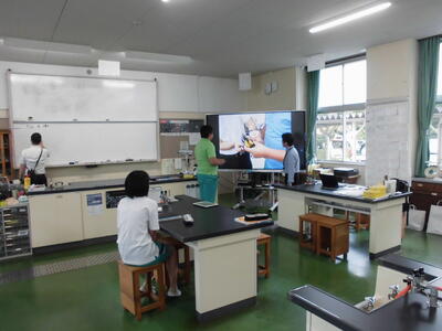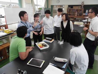 化学電池の学習でした。初めに前回つくったトマト(Mg-Cu)電池とレモン(Zn-Cu)電池の様子を振り返りました。株式会社GSユアサエナジーの佐々木氏を講師に迎えました。講師の方に生徒たちが疑問に思っていることを質問しました。電池の性能を上げるコツ、反対に性能を下げる原因などについて教えていただきました。後半は、マンガン電池を作成し、豆電球に明かりをともしました。