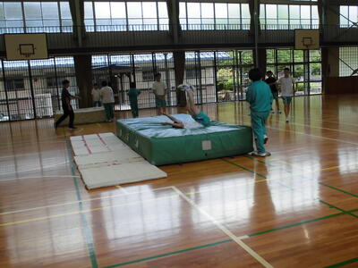 高跳び(背面跳び)の授業でした。初めは、マットに背を向け空中姿勢を作る練習をしていました。高く上がり、脱力して弧を作り、背中から落ちる。簡単なようでなかなか難しそうです。そのあと、3歩の助走から、上に上がる練習へと移っていきました。手や足を振り上げ、前から後ろへ、そして上へ。ふわりと上がる生徒もいました。