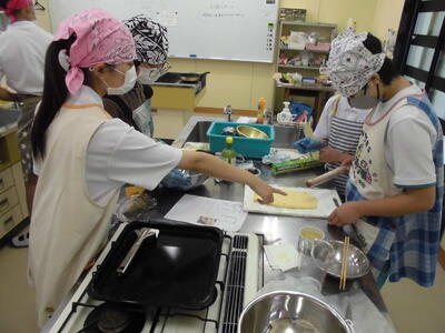 お菓子作りの授業でした。4つの班に分かれて作っていました。