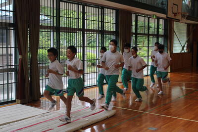 お盆が明けました。全員そろって、駅伝練習を始められました。あいにくの雨で、体育館での練習スタートです。
