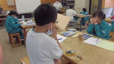 木材、金属、プラスチックについて、「丈夫さ」「見た目」「におい」「手触り」「水による変形」「熱の伝わり方」「電気の伝わり方」などについて調べました。においは、木のにおい、つんとしたにおいなど、それぞれが感じた特徴をノートにまとめていました。木材、金属、プラスチックそれぞれの特徴を生かして製品が作られていることを学習していきます。