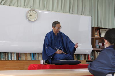 美術の非常勤講師の荒岡先生は今日は苦楽師匠となって落語を上演してくださいました。