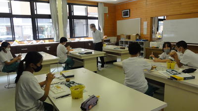生徒達は、これまでじっくり見たことがなかったイカの内臓に興味津々でした。ひとつひとつの内臓が何かをプリントと見比べながら確認したり、外とう膜と内臓の付け根がボタンのようにくっついていることを何度もつけ外しをしたりしていました。また、イカの眼球を取り出し、眼球からレンズをきれいに取り出した生徒は「記念にしたい」とまで言っていて、動物の体の構造への興味の高さがわかりました。このことを大切にして日々の授業をしたいと改めて感じました。