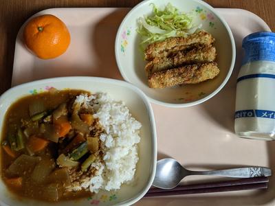 冬至カレー・牛乳・ちくわのチーズフライ・キャベツ・みかん