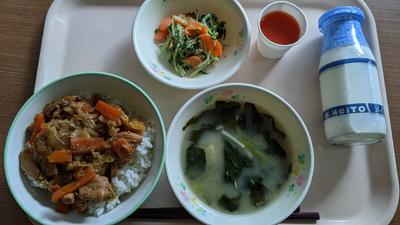 東栄チキン丼・牛乳・水菜とツナのごま和え・小松菜の白みそ汁・トマトジュース