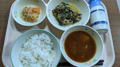 ごはん・牛乳・ほうれん草と豚肉のバター炒め・こんにゃく寒天サラダ・かぶのみそ汁