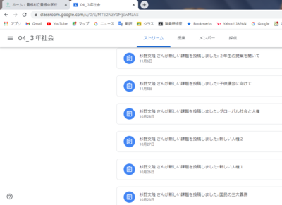 このように、「3年社会」というネット上の教室に課題が出されます。(生徒個人のGmail、@toyonejh.comにも通知されます。)