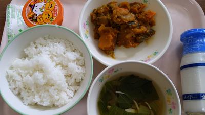 ごはん・牛乳・鶏肉とかぼちゃの揚げ煮・チンゲン菜とカニカマのスープ・パンプキンババロア