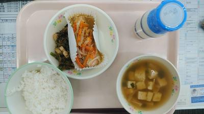 ごはん・牛乳・鮭のマスタード焼き・ほうれん草とれん根のおかか和え・あさりのすまし汁