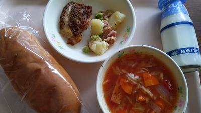 ミルクロール・牛乳・グリルチキンのハーブ風味・ミネストローネ・ジャーマンポテト