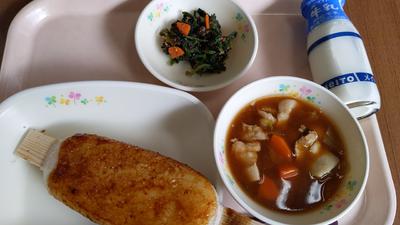 五平餅・牛乳・具だくさん豚汁・ほうれん草のおかか和え