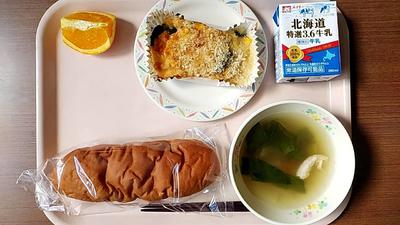 米粉パン・えびとほうれん草グラタン・コンソメスープ・オレンジ1/6 1/4