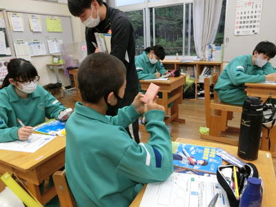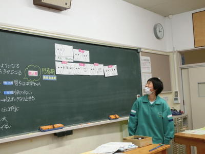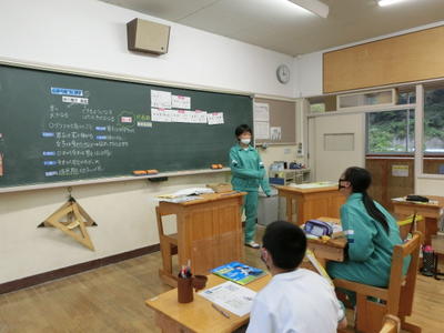 2年社会の地理では、豊根村について勉強をしています。今日は、地域おこし協力隊の方からお話をいただきました。