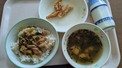 豊根スタミナ丼・牛乳・鶏軟骨唐揚げ・磯の香汁