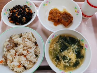 五目おこわ・揚げ出し豆腐のおろしがけ・ひじきの含め煮・かき玉汁・牛乳