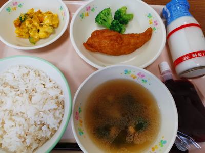 麦ごはん・牛乳・ささ身のレモンソースがけ・ひじきの含め煮・かき玉汁