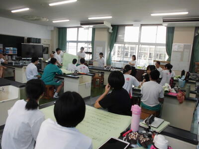 音の発生と伝わり方の授業でした。音は濃いところと薄いところができて伝わっていく。ギターの弦等は、弦が震えて音を出している。音は、固いものでも、柔らかいもでも、空気でも、水でも、空気でも伝わる。など、音の伝わり方をモデルを使いながら学習していました。