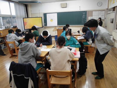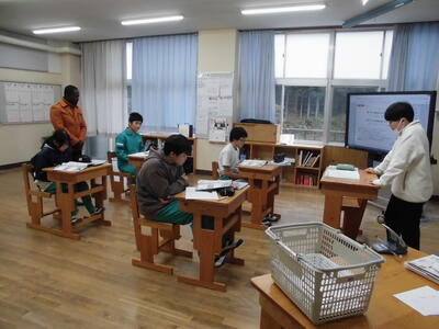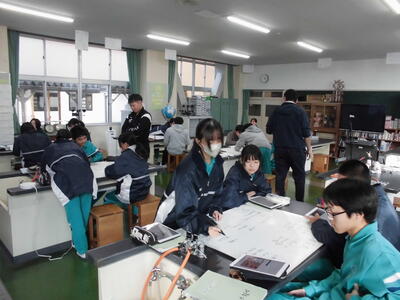 全校での総合的な学習の時間です。今日は班ごとで今までの成果と課題を出し、ラウンドスタディ方式で、みんなで意見を交換し合いました。