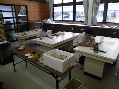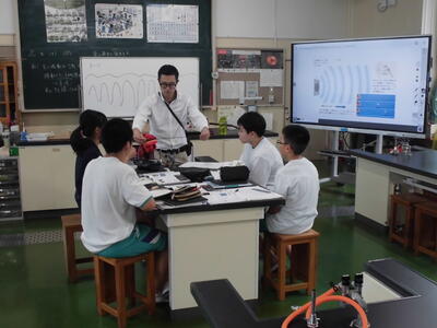 音の発生と伝わり方の授業でした。音は濃いところと薄いところができて伝わっていく。ギターの弦等は、弦が震えて音を出している。音は、固いものでも、柔らかいもでも、空気でも、水でも、空気でも伝わる。など、音の伝わり方をモデルを使いながら学習していました。