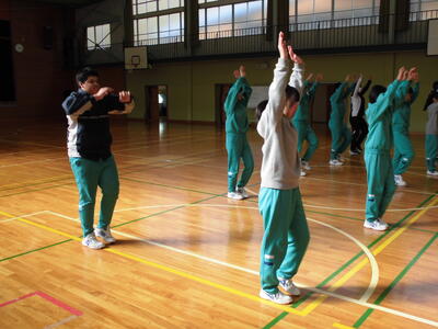 東栄町から尾林さんを講師に迎え、ダンスの授業です。楽しく、リズムに乗って、体を動かす(表現する)ことを目標に頑張りましょうと、体育の鵜飼から本日の目標が告げられました。体操、フィットネスダンスの後、リズムをとる練習に入りました。手を打つ(ゆっくり→早く)、膝を曲げる、手をあげる、左右に動く、どんどんレベルアップしていきます。生徒たちは、リズムに乗って、とても楽しそうに体を動かしていました。