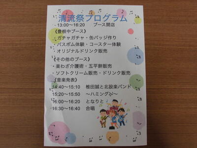 来週11月26日(水)に「ゆ~ランドパルとよね」にて清流祭を行います。プログラムと会場マップができましたので、お知らせします。