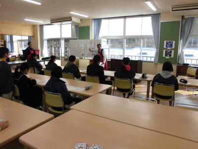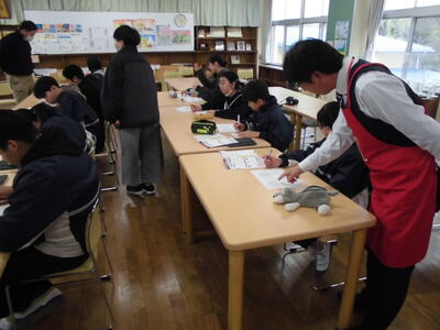 村内の郵便局長さんなどが見えて、手紙の書き方教室が開かれました。普段から手紙を書くことが少なくなったこの頃です。生徒たちは説明をしっかり聞き、丁寧に葉書に文字を書いていました。