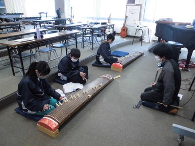 琴の演奏です。生徒それぞれが「さくら さくら」の曲をアレンジしています。速度や、音の大きさ、振るわせ方などをそれぞれの思いを形にしています。この後、一人ずつ発表し、感想を言い合う予定です。