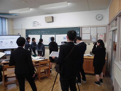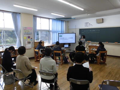 大地の変化の授業です。本日は設楽中学校、東栄中学校とつながって、3校合同の授業でした。各学校の周りの岩石から北設の過去の出来事について話し合いがなされました。